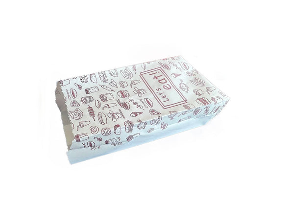 Onze Snackzakken zijn gemaakt van stevig, duurzaam papier dat biologisch afbreekbaar is, waardoor je een milieuvriendelijke keuze maakt voor jouw zaak. De vrolijke opdruk "Let's Eat!" zorgt voor een leuke uitstraling die klanten aanspreekt en hen aanmoedigt om van hun bestelling te genieten.